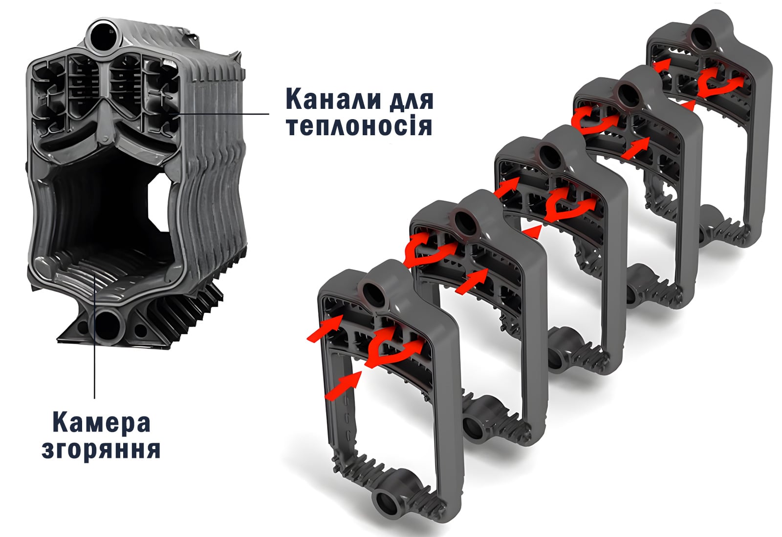 Секційний теплообмінник в чавунному твердопаливному котлі
