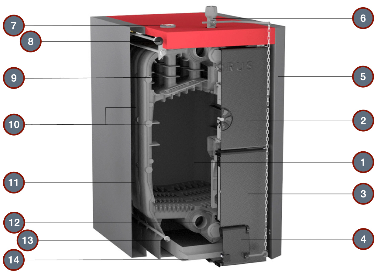 • Примітивна конструкція теплообмінника – секційні котли мають просту будову з мінімальними каналами для димових газів. На відміну від котлів тривалого горіння з багатоступеневим теплообміном, тут значна частина тепла просто «вилітає в димохід». Це знижує ККД, що напряму впливає на збільшення витрати палива.