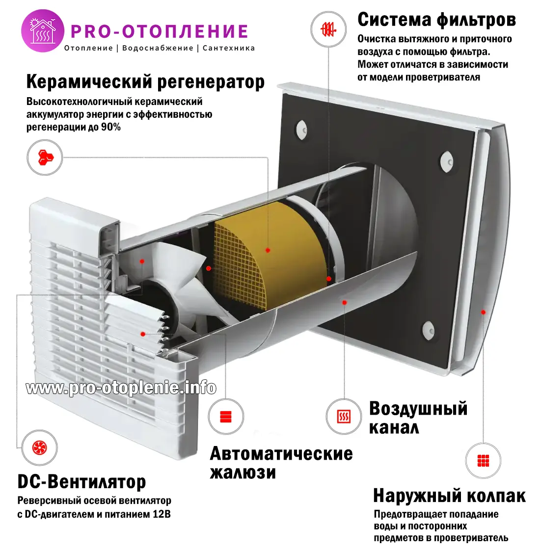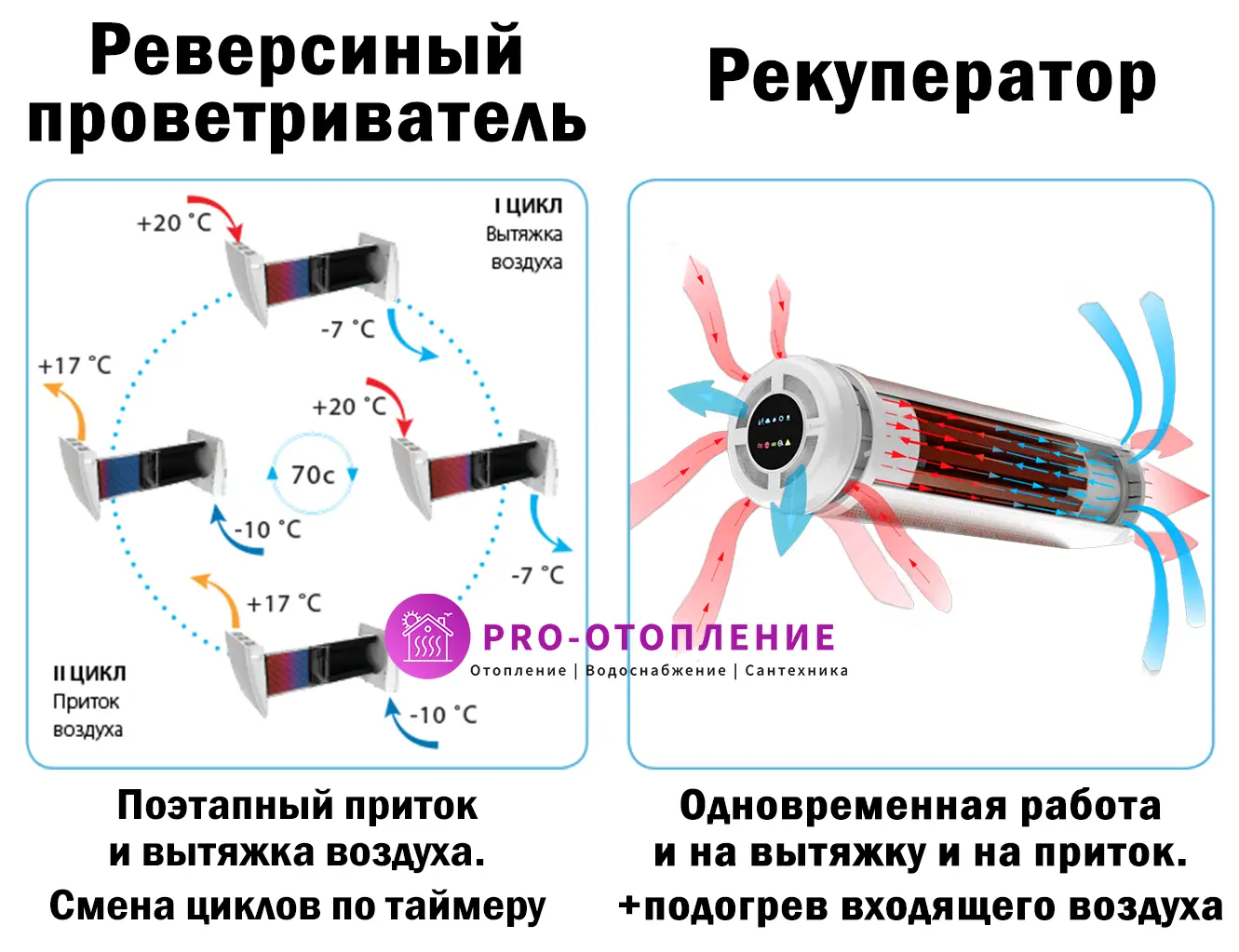 - Реверсивный проветриватель же просто меняет направление воздушного потока, обеспечивая как приток свежего воздуха, так и вытяжку отработанного, но без переноса тепла между потоками.