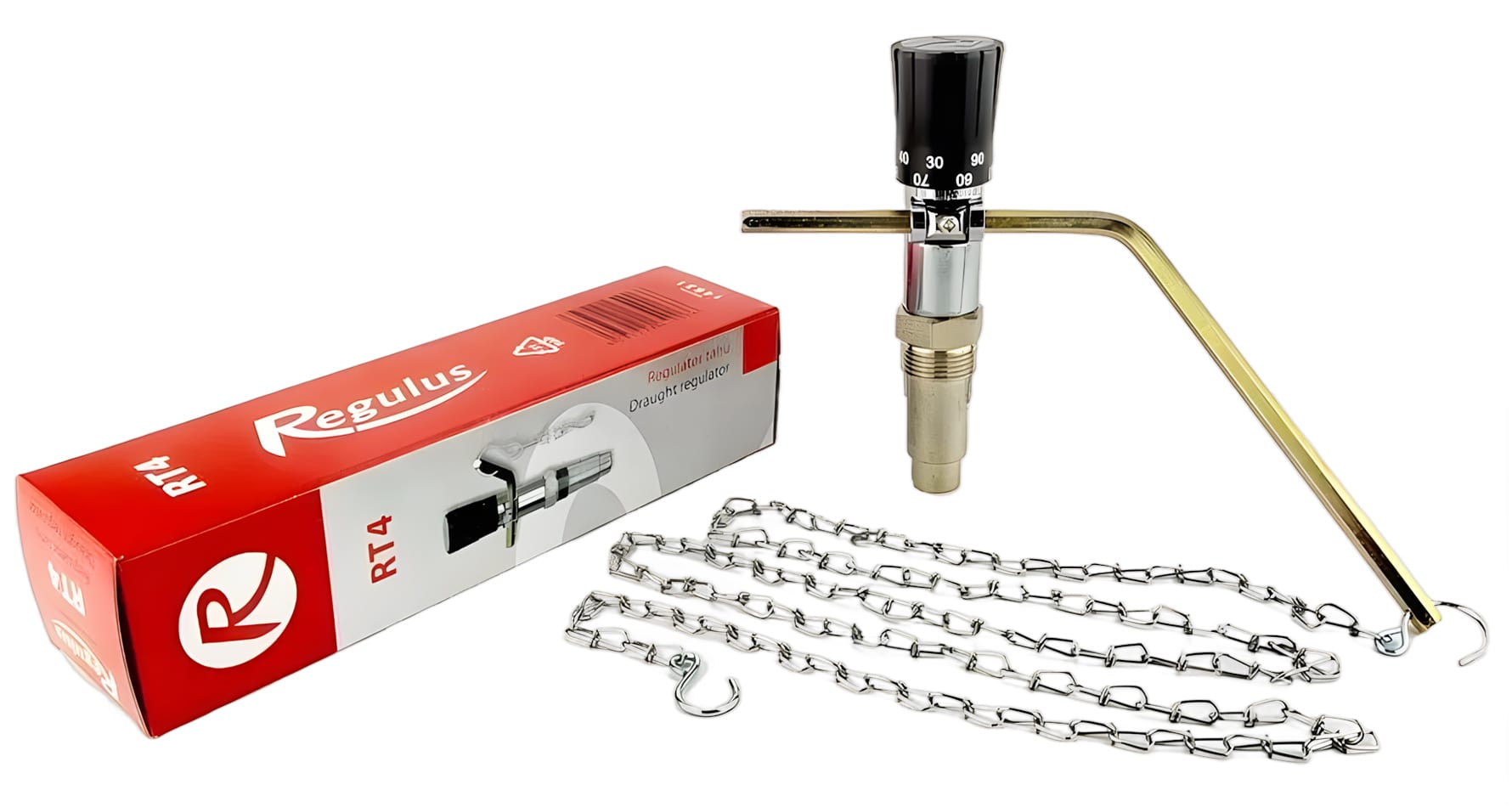 Принцип работы: при изменении температуры воды в водяной рубашке котла термоголовка регулятора поворачивается и цепочка закрывает или открывает заслонку, а вместе с ней и доступ воздуха в котел. Таким образом контролируя интенсивность горения топлива.