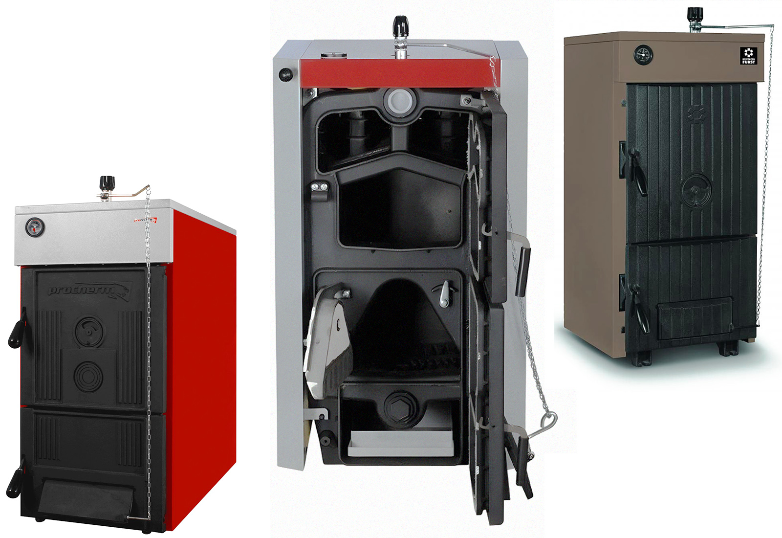 Внешний вид популярных чугунных твердотопливных котлов: Protherm Бобер 20 DLO, Viadrus U 22 C/D 7, Kentatsu Furst ELEGANT-03