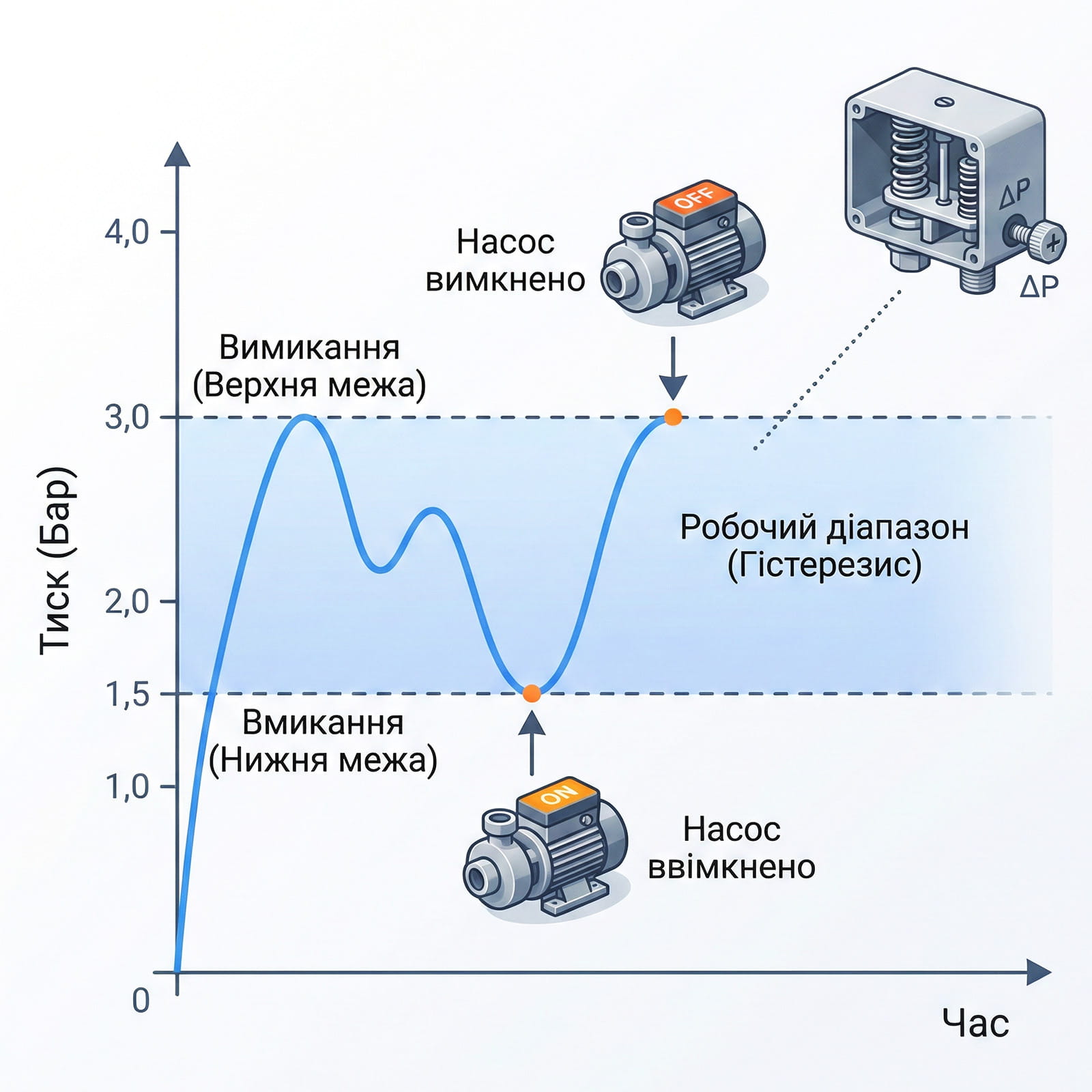 - Приклад: насос стартує при 1,5 бар (Pmin), а зупиняється при 3,0 бар (Pmax). Це дозволяє набрати чайник води або помити руки, використовуючи запас води з бака, не запускаючи потужний двигун насоса.