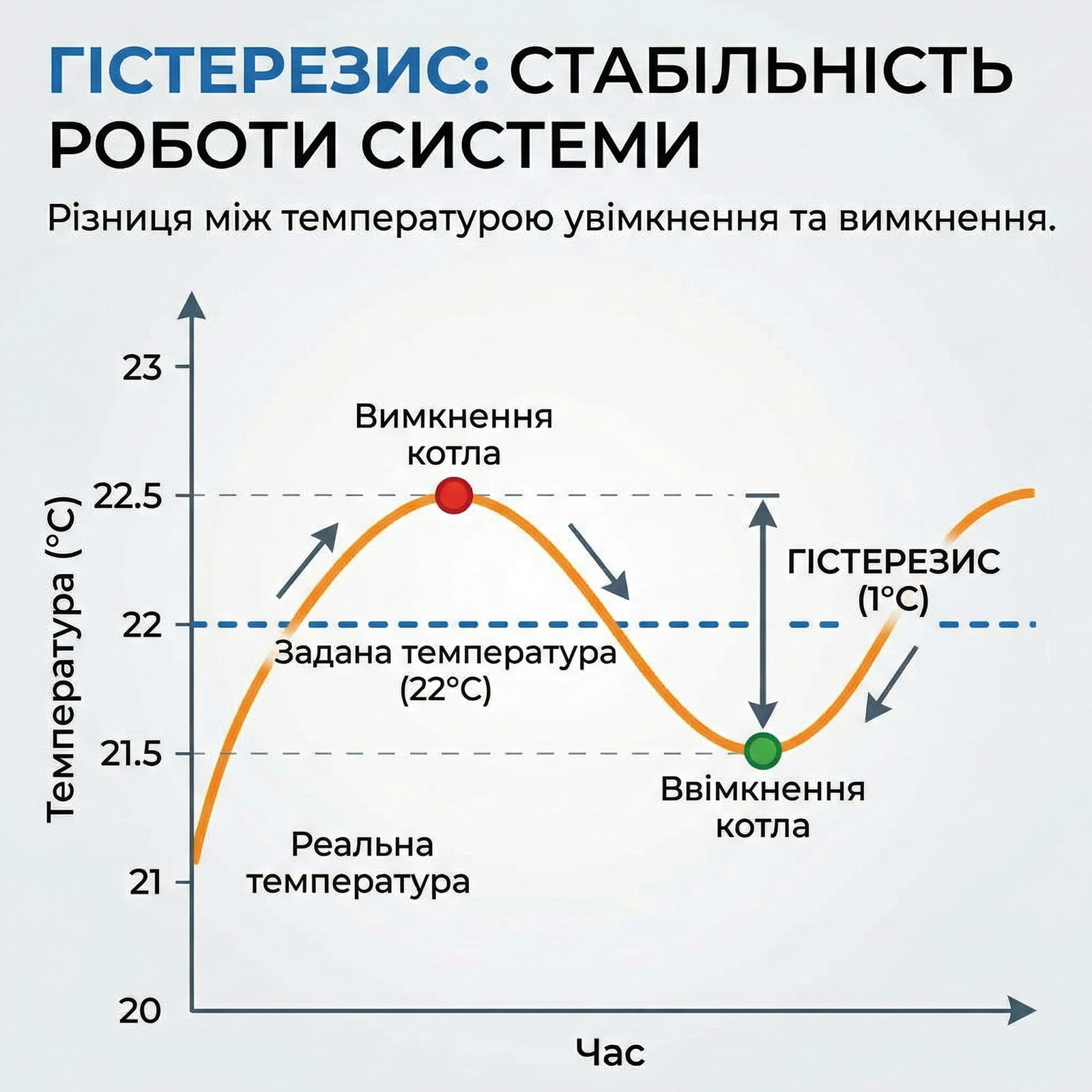Оптимальним вважається гістерезис у межах 0,2°C – 0,5°C.
