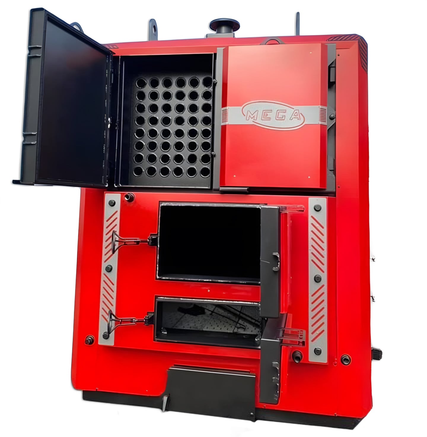 Пелетний котел MEGA Pellet – це промисловий твердопаливний котел з автоматичним пелетним пальником потужністю 1500 кВт. Корпус умовно складається з трьох частин: нижньої частини топки з товстостінними трубами і постійною циркуляцією теплоносія, зольної частини та конвекційної частини з двома рядами жарових труб над топкою.