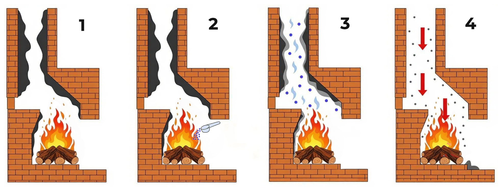 Що відбувається після згоряння порошка: протягом наступних днів активні речовини продовжують руйнувати відкладення сажі, роблячи їх крихкими та легкими для видалення. При профілактичному використанні це запобігає утворенню товстого шару креозоту, який складно видалити механічно.