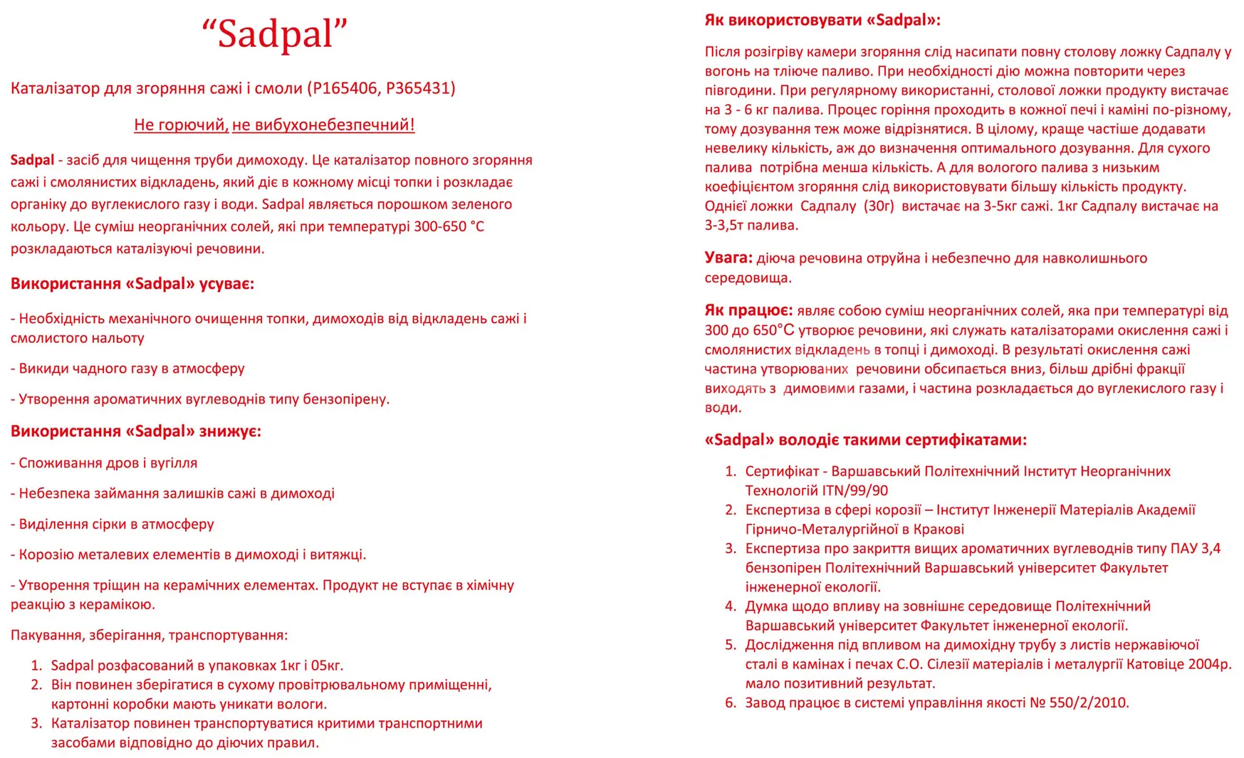 Sadpal першим вийшов на український ринок порошків для чистки котлів і димоходів, за що справедливо заслужив гарне «сарафанне радіо» і чудові відгуки користувачів. На сьогодні цей очисник димоходів має всі переваги якості та низької ціни, що і є його головною перевагою – не такий дорогий як Ханса, і більш стабільно працює з будь-яким паливом на відміну від Спалсадза.