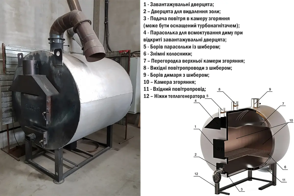 Теплогенератори можуть виготовлятися з різною конструкцією і зовнішнім виглядом, мати додаткові камери згоряння, теплообмінники, автоматику та інші збільшуючі ККД “примочки”, але по суті це та ж піч, тільки в більшому масштабі і з примусовим прокачуванням повітря.