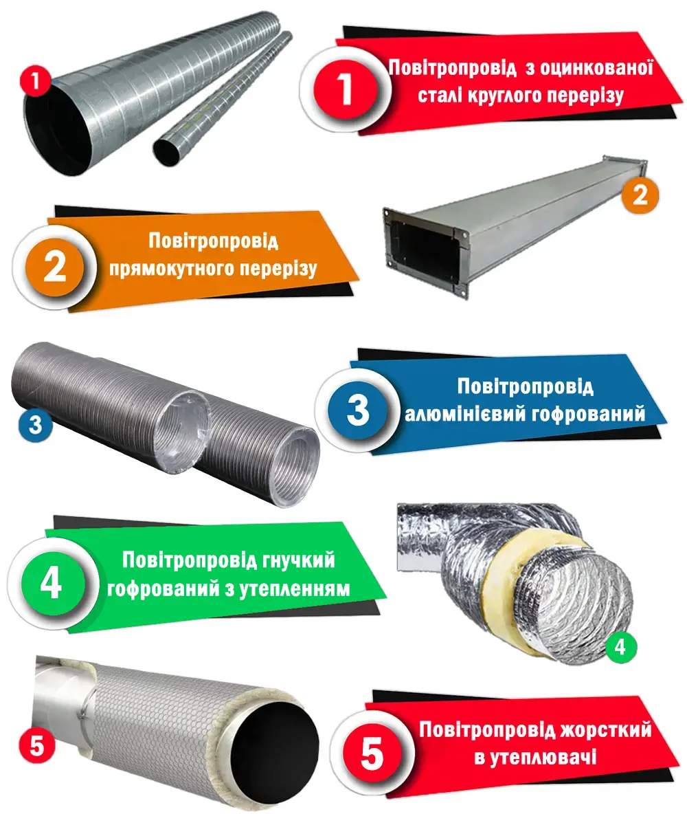 На відміну від звичайної системи вентиляції, тут транспортується гаряче повітря, відповідно про ПВХ або інші, дешеві, але пожежонебезпечні матеріали не варто навіть думати!