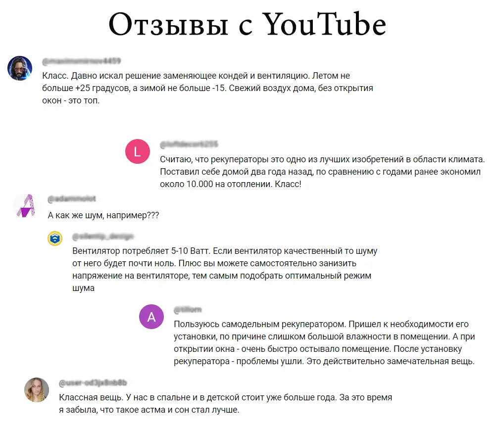 Отзывы под видео (на YouTube) о рекуператорах воздуха