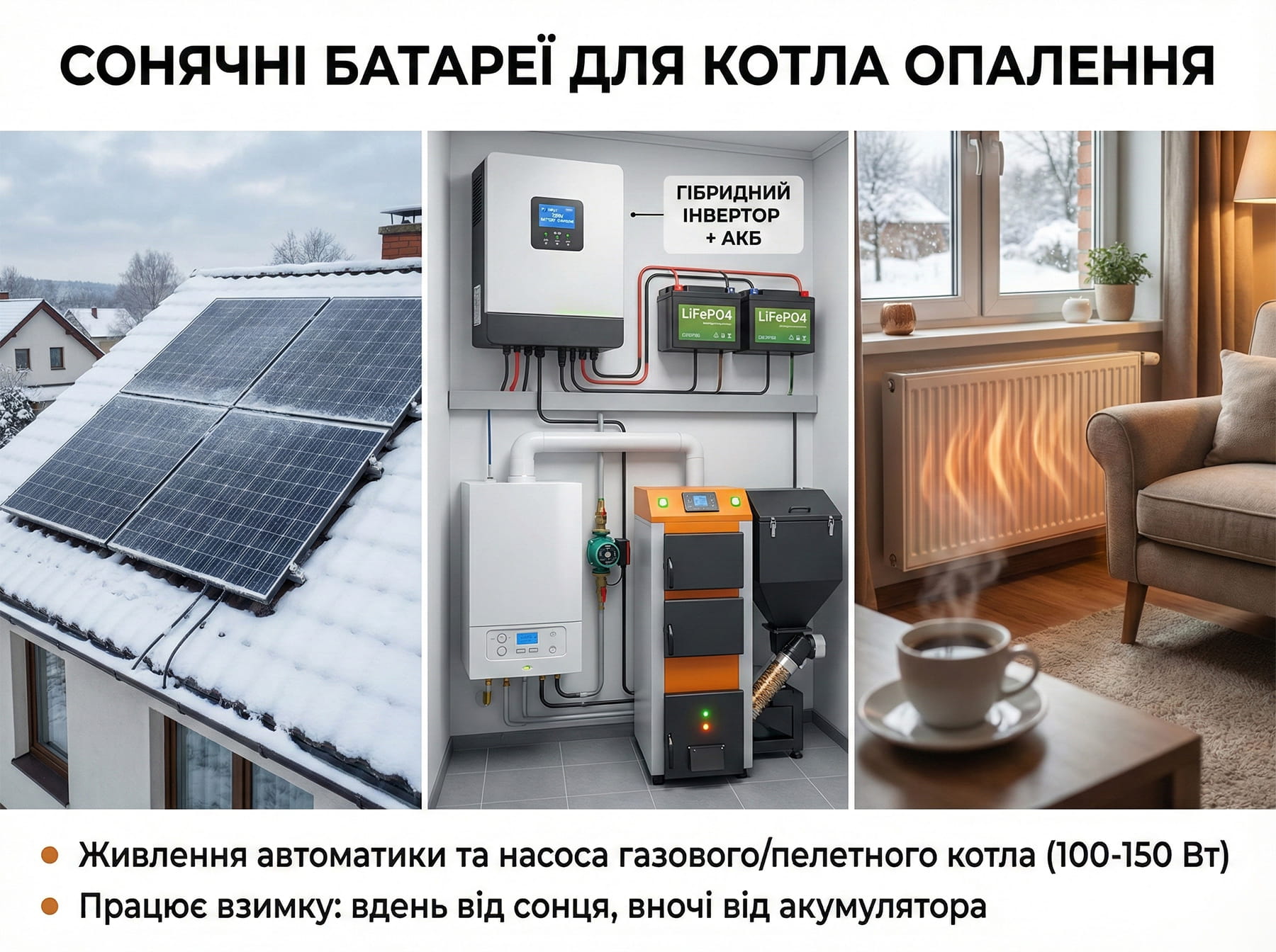 Схема така: встановлюється 2-4 сонячні панелі + гібридний інвертор з акумулятором. Вдень, навіть у хмарну погоду взимку, панелі виробляють достатньо енергії, щоб живити автоматику котла і підзаряджати акумулятор. Вночі система працює від батареї.